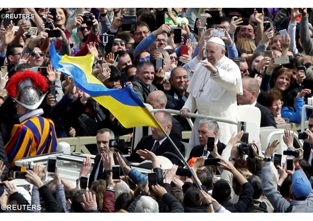 «Плодів миру просимо для України, аби зміцнювалися кроки на користь згоди та були полегшені можливості для здійснення гуманітарних ініціатив, яких потребує населення», – також і в цьогорічному Великодньому посланні «Місту та світові», виголошеному опівдні, 1 квітня 2018 р., з лоджії базиліки Святого Петра, Папа Франциск підніс молитву за мир в Україні.