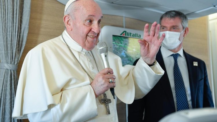 У понеділок, 8 березня, завершилася Апостольська подорож Папи Франциска до Іраку. В обідню пору літак зі Святішим Отцем на борту приземлився у римському міжнародному аеропорту Чампіно. Повертаючись до Ватикану, Святіший Отець, вірний своєму звичаєві, зробив зупинку в базиліці Santa Maria Maggiore, аби подякувати Пресвятій Богородиці за супровід під час подорожі та за її успішне проведення. Під час перельоту, як звичайно, відбулося спілкування з журналістами.