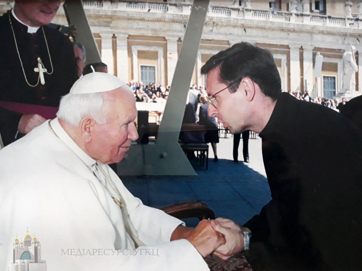 – Я тоді був віце-ректором Львівської духовної семінарії, викладачем богослов’я, і був за лаштунками цього візиту, якщо так можна сказати. Але мав нагоду підійти до Івана Павлі ІІ 27 червня, на урочистій Літургії на іподромі у Львові. Там було півтора мільйона людей, і я був одним із церемонієрів – тих, хто допомагали в організації цього богослужіння. Моїм обов’язком було підготовляти людей до приїзду Святішого Отця. Пригадую, як тоді ці півтора мільйона людей одним голосом співали: «Україна любить папу!». Пригадую також коментар одного російського видання про цю мою акцію: «Псевдомонах без бороди, в рясі з широкими рукавами, загіпнотизував півтора мільйона людей і заставив їх кричати «Україна любить папу» (сміється). Насправді ж це був півторамільйонний голос радості люблячих і вдячних сердець.