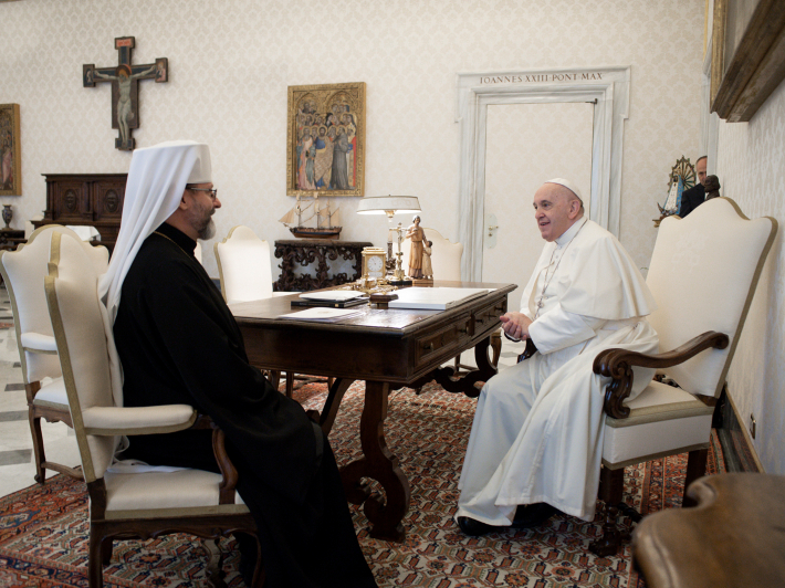 Сьогодні в бібліотеці Апостольського палацу у Ватикані Святіший Отець Франциск прийняв на аудієнції Блаженнішого Святослава, Главу і Отця УГКЦ. У розмові з папою Франциском Блаженніший Святослав розповів про душпастирське служіння УГКЦ в умовах пандемії та головні сучасні виклики і проблеми українського суспільства.