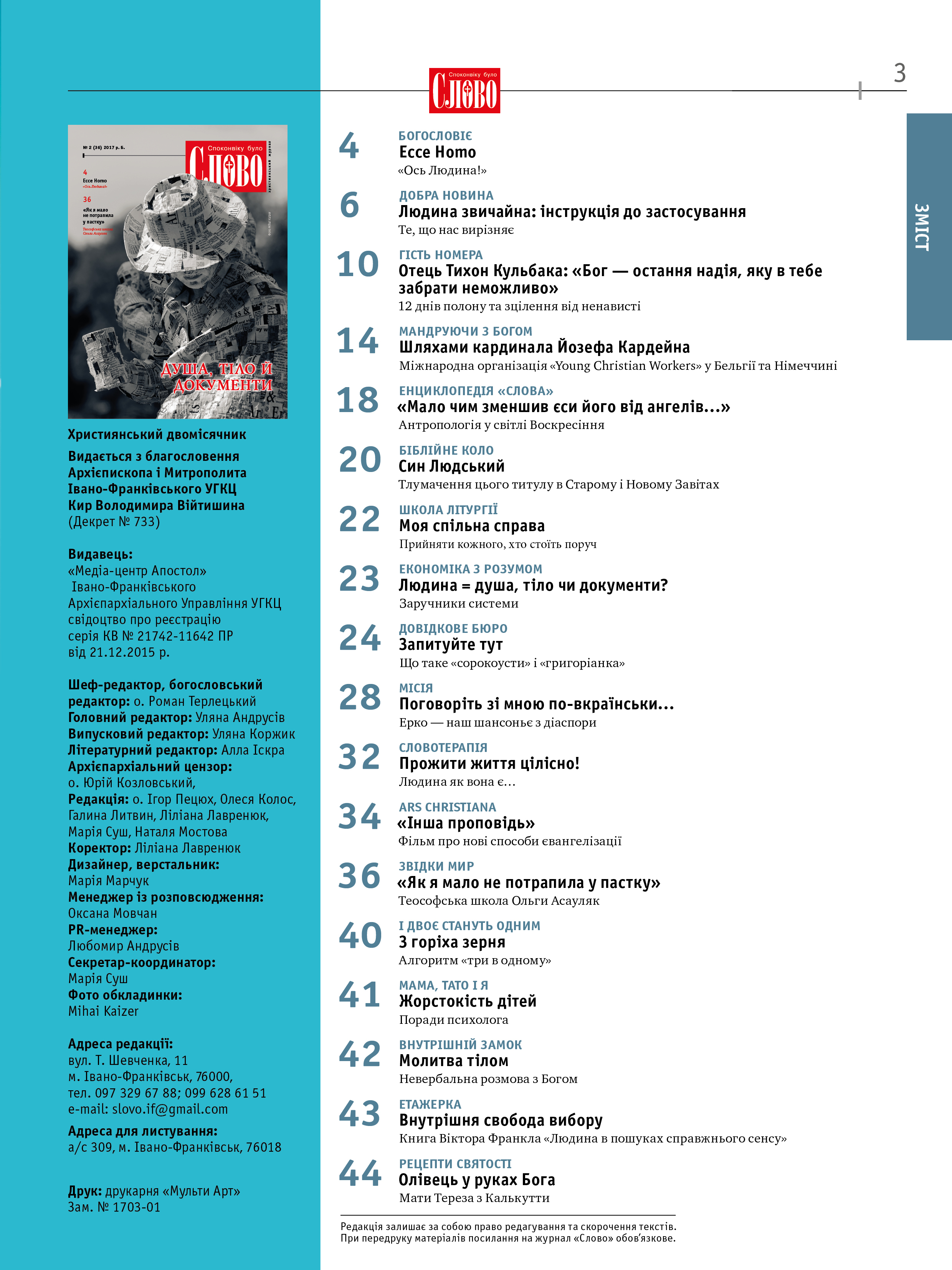 Гість номера — отець Тихон Кульбака, який пережив 12 днів полону в терористів, — ділиться пережитим та наголошує, що «суть християнської антропології — триєдність. Ми покликані гармонійно дбати про душу, тіло й духа. Наприклад, люди можуть сповідатися, причащатися, але в емоційній сфері бути неврівноваженими, а це призводить до психосоматичних недуг, тіло страждає».
