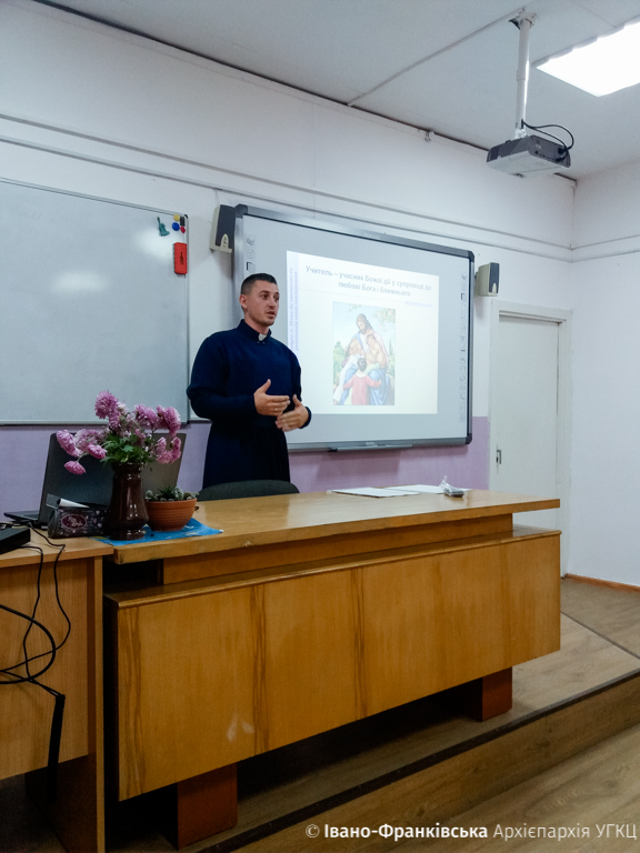 Семінар поділявся на два блоки. Перший висвітлив о. Іван Луцишин, представник Комісії освіти і виховання при Івано-Франківській Архієпархії, котрий подав два модулі на тему «Покликання учителя до любові і витривалості». Виступ був підсилений практичними прикладами і звернений на особу учителя, як доброго і люблячого провідника. «Учитель – один із тих, хто також може допомогти розпізнати покликання своїм учням. Адже саме уважний вчитель одним із перших помічає здібності, нахили, схильності юної людини» – зазначив о. Іван.