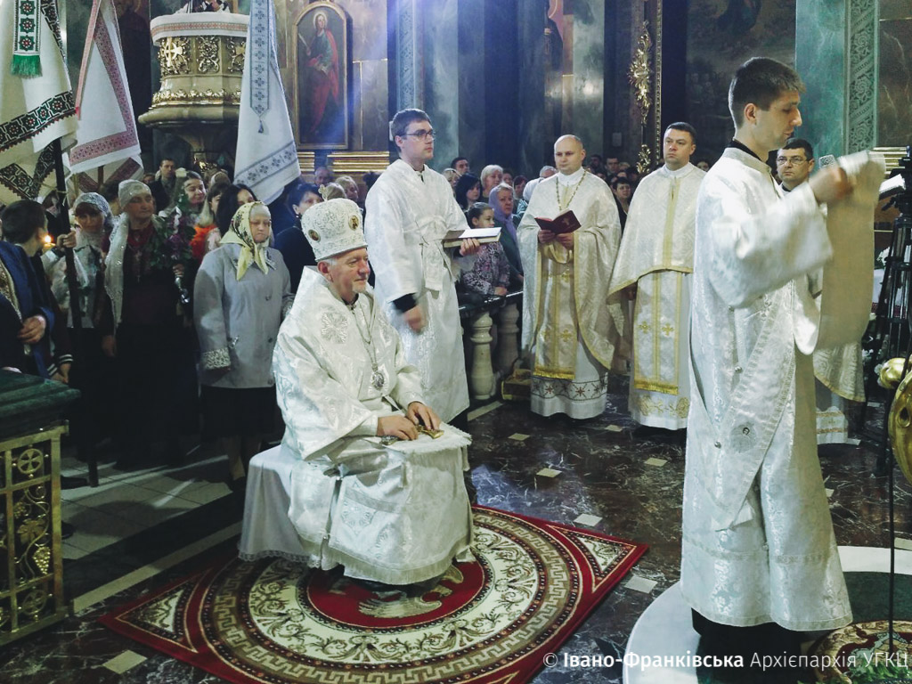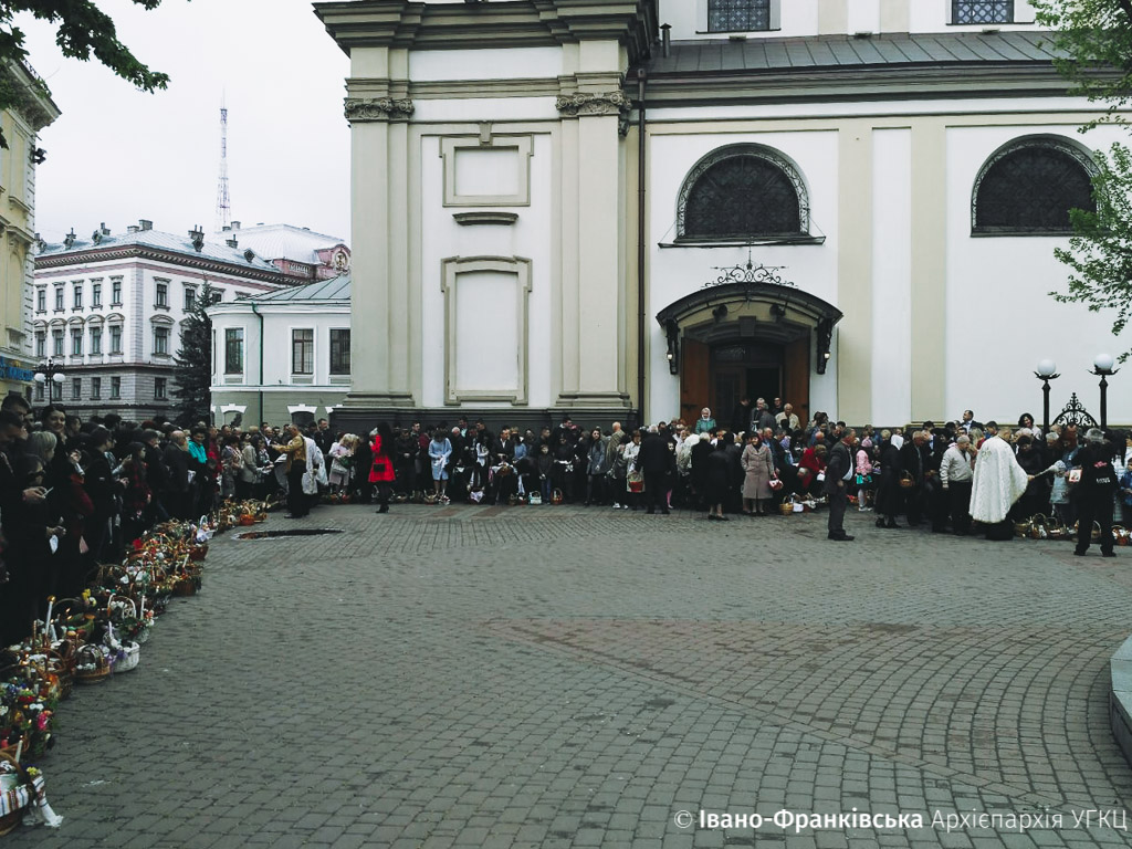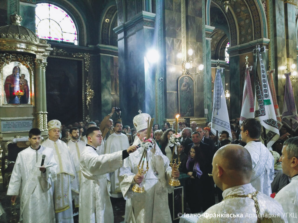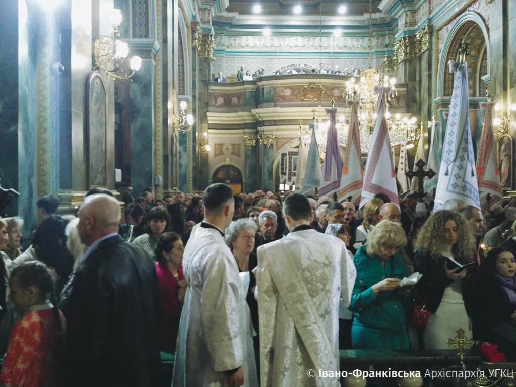 Рано-вранці франківці чисельно зібрались в Архікатедральному і Митрополичому Соборі Воскресіння Христового на Пасхальну відправу. Очолив богослужіння Архієпископ і Митрополит Івано-Франківськи Владика Володимир Війтишин.