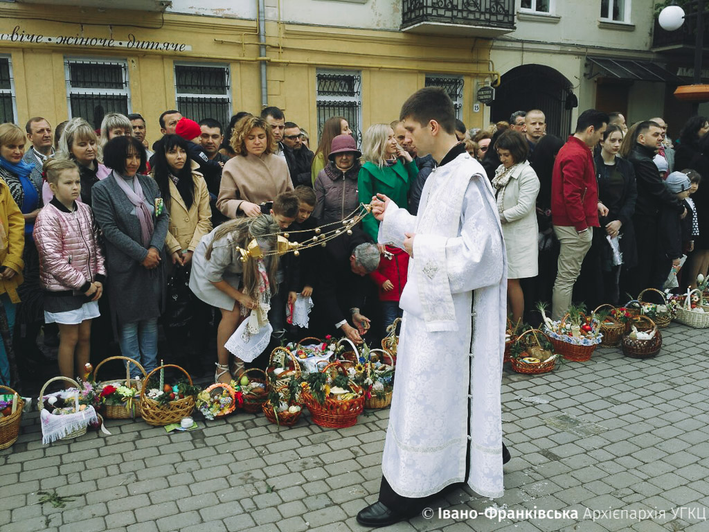 Після відправи усі вийшли на площу А. Шептицького, де наш Митрополит спільно з священиками освятили міській громаді великодні кошики.