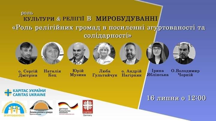 У четвер, 16 липня, о 12:00 відбудеться онлайн конференція на тему "Роль релігійних громад в посиленні згуртованості та солідарності". Захід організовує Карітас України в рамках дводенної конференції "Роль культури та релігії в миробудуванні. Співорганізатори – Карітас Івано-Франківськ, Карітас Маріуполь та Карітас Київ.