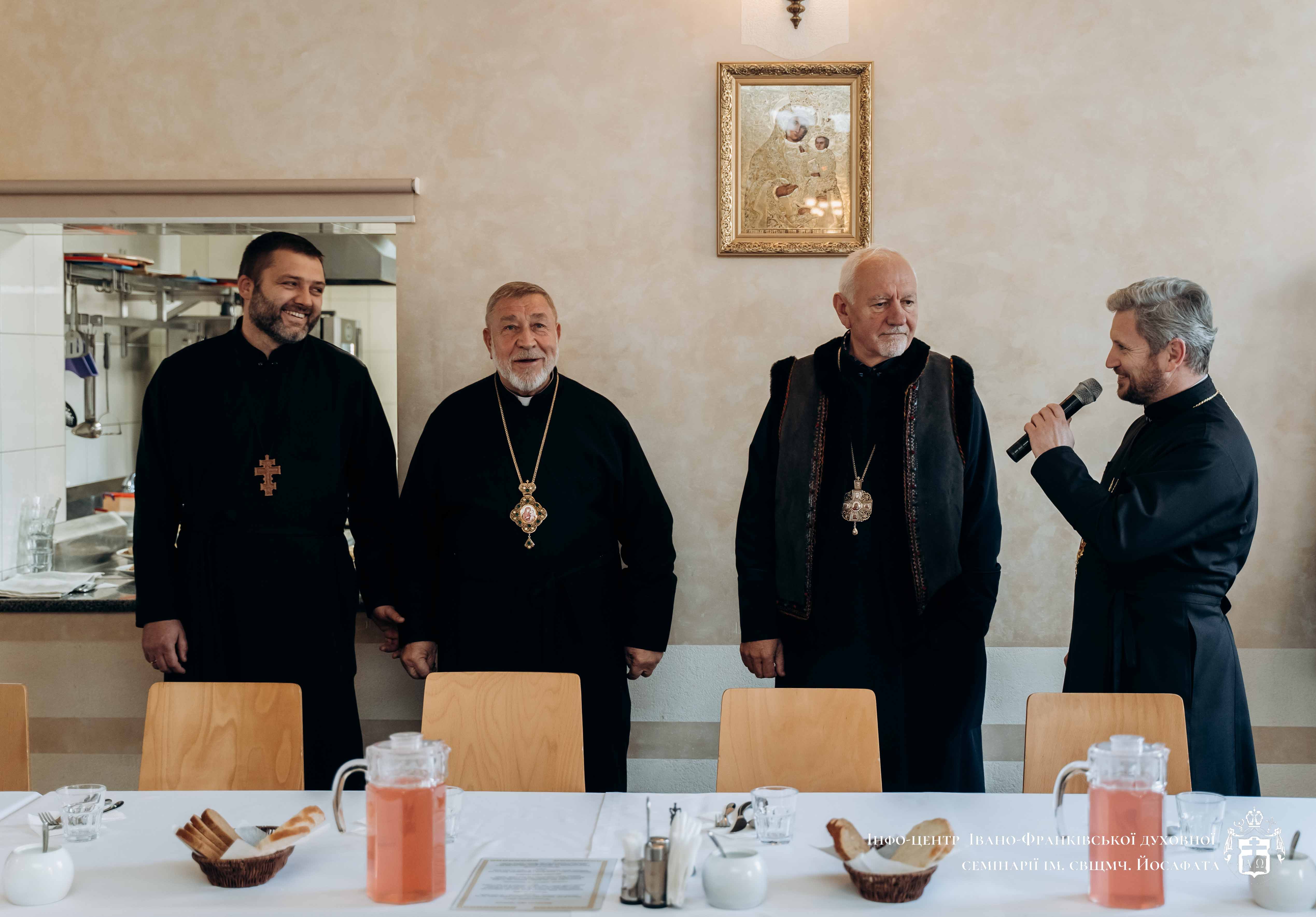 Зустріч розпочалася зі спільного обіду, на якому окрім високодостойних гостей та членів ректорату був присутній Архієпископ і Митрополит Івано-Франківський Владика Володимир Війтишин. Отець-ректор Олексій Данилюк привітав гостей, після чого владика Степан поблагословив трапезу й усі приступили до спожитку.